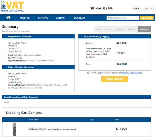 Step 8 - As the last step, please verify all the information. In case everything is correct, you can place the order by clicking the SEND ORDER button.
