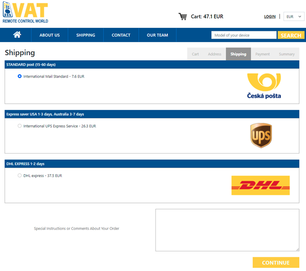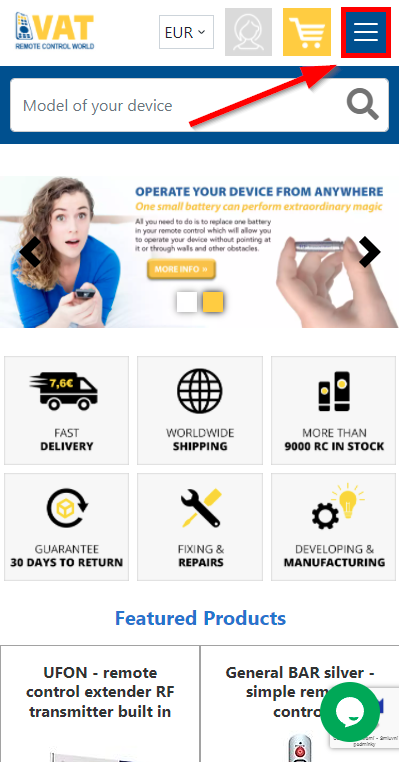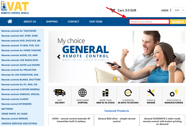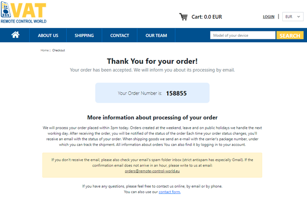 If you have any questions about your order or you need any help with searching the appropriate remote control, do not hesitate to contact us via email orders@remote-control-world.eu or via online chat on the website.