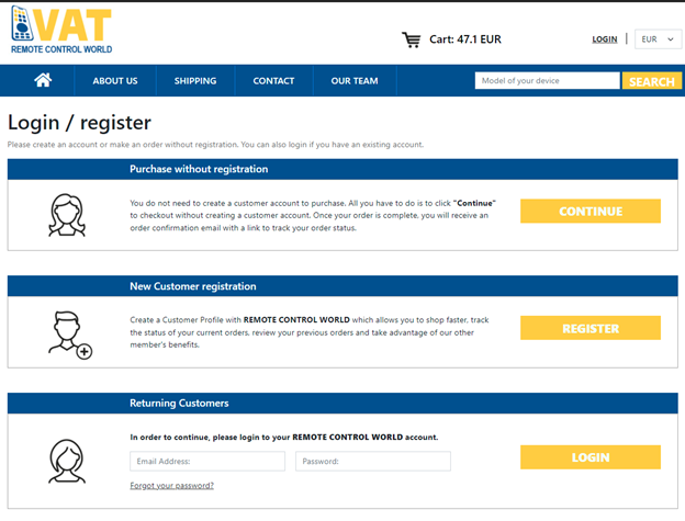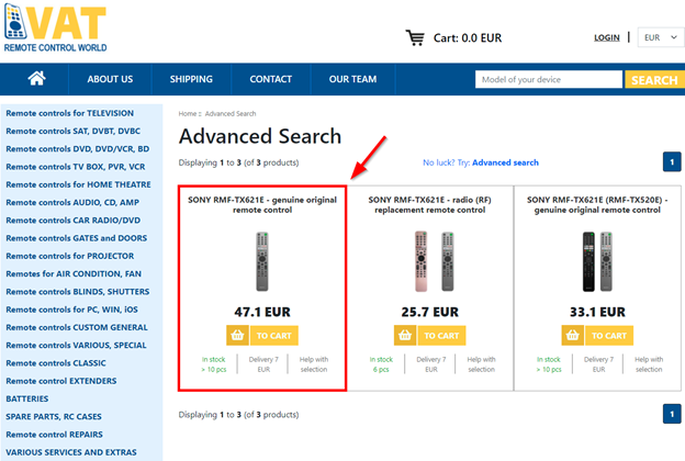Step 2 - Once You see a suitable remote control, you can simply add it to cart by clicking the yellow button. You can also enlarge the picture by hovering over it or view the remote control’s description by clicking on the name or the picture.