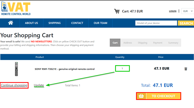 Step 3 - After adding the remote control to your cart, you will be redirected to the cart itself. You can either continue TO CHECKOUT or continue shopping.