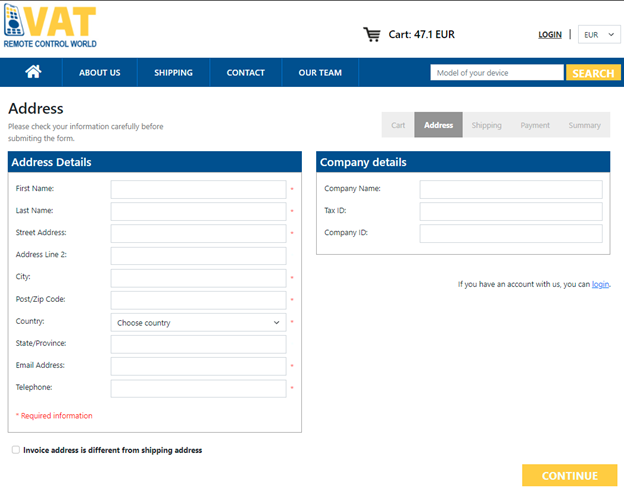 Step 5 - In case you will continue without registration or have registered just now, you will have to enter your address