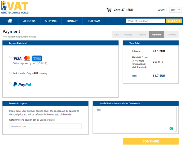 Step 7 - On the payment page, you can choose a payment method, insert a discount coupon or update your order comments.